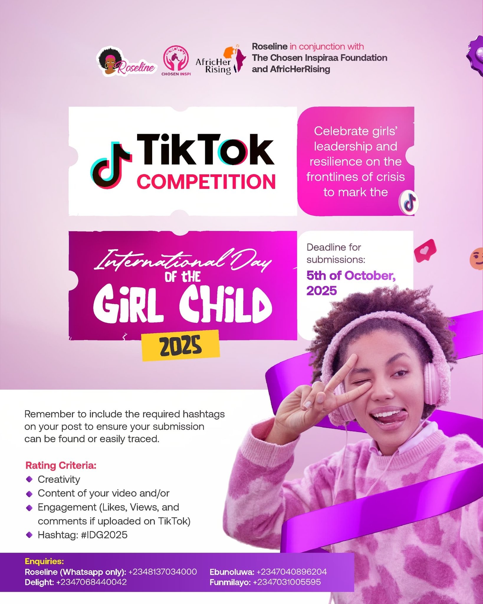 Roseline, in conjunction with The Chosen Inspiraa Foundation and AfricHer Rising presents a TikTok Competition to mark the International Day of the Girl Child 2025.