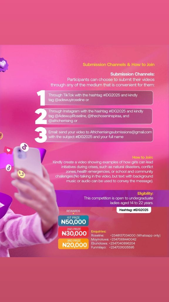 Instagram: Use hashtag #IDG2025 and tag @AdewuyiRoseline, @thechoseninspiraa, @africherrising